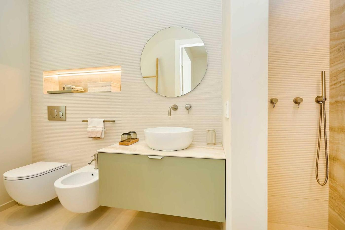 Questa casa vacanze con aria condizionata comprende 3 camere da letto e 2 bagni con bidet, doccia e asciugacapelli. La cucina comprende frigorifero, lavastoviglie e forno, più macchina da caffè e bollitore elettrico.