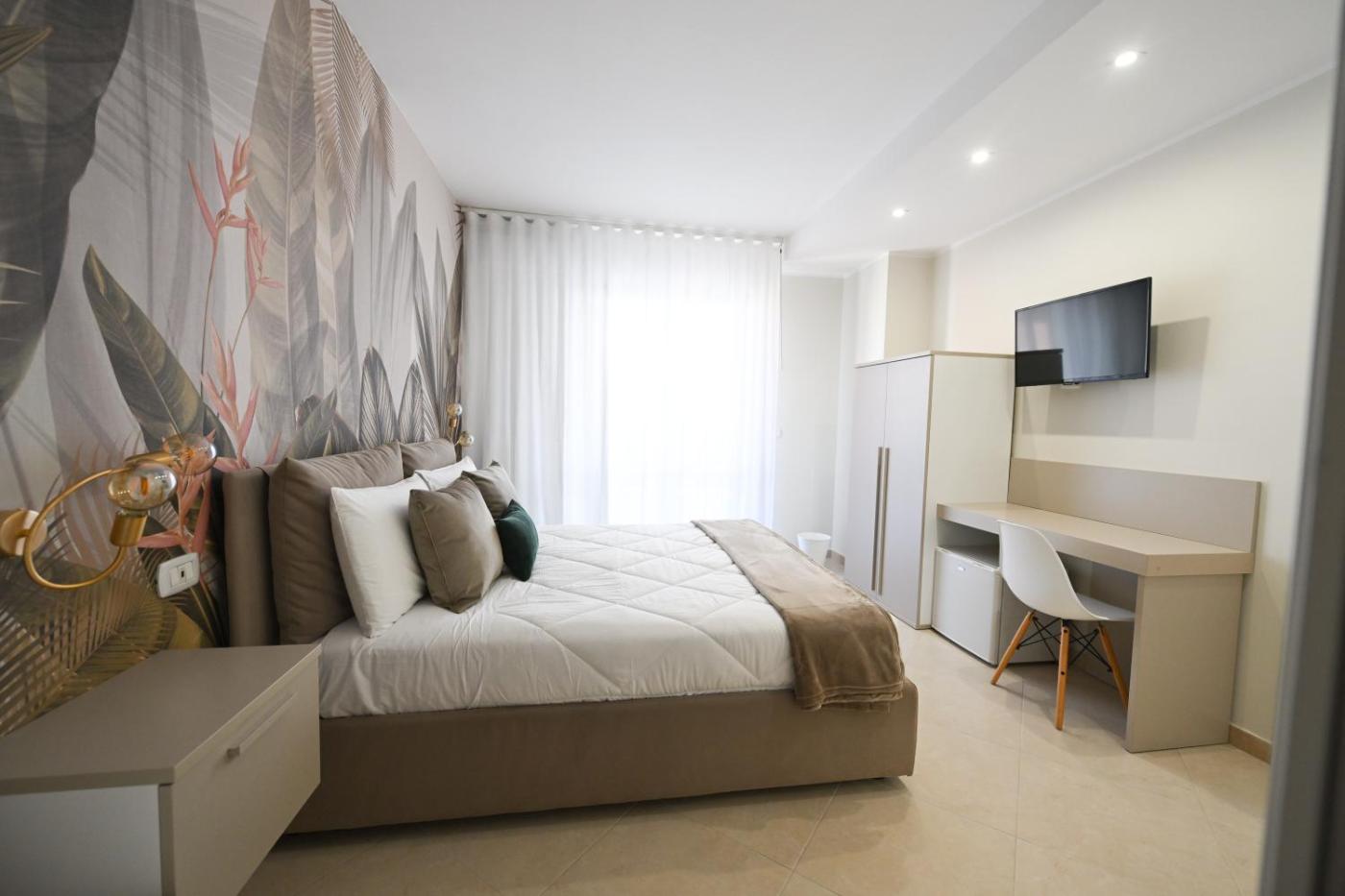 Camera Deluxe (2 Adulti + 1 Bambino). Ampia camera matrimoniale con aria condizionata, ingresso indipendente, bagno privato con doccia e balcone affacciato sul mare. L’alloggio presenta 1 letto.