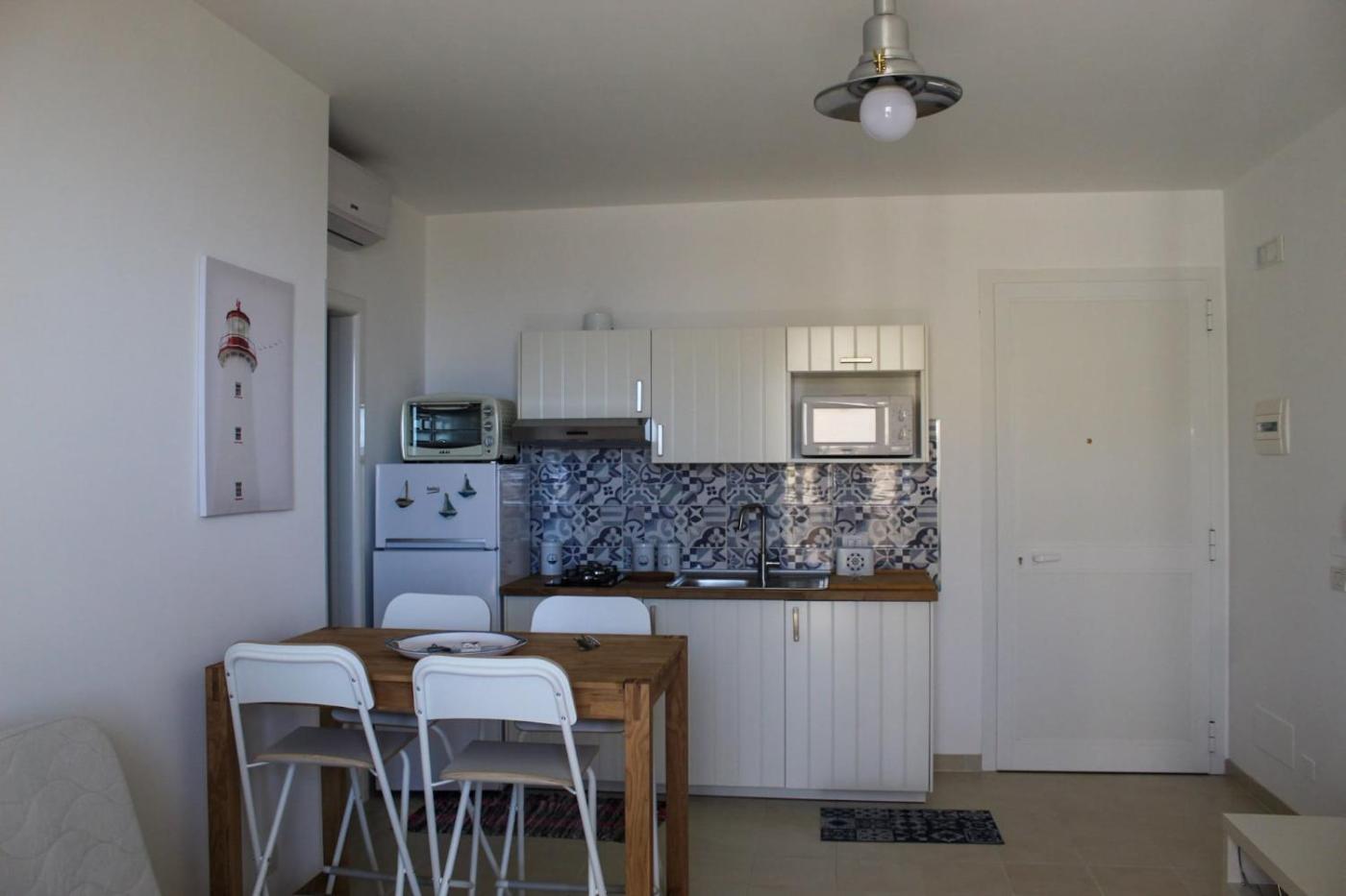 Appartamento con 1 Camera da Letto. Appartamento dotato di 1 camera da letto separata, aria condizionata, 1 soggiorno, 1 bagno con doccia, e cucina ben attrezzata con frigorifero, piano cottura e forno a microonde. La sistemazione dispone di TV a schermo piatto, lavatrice e terrazza affacciata sul mare. L’alloggio presenta 2 letti.