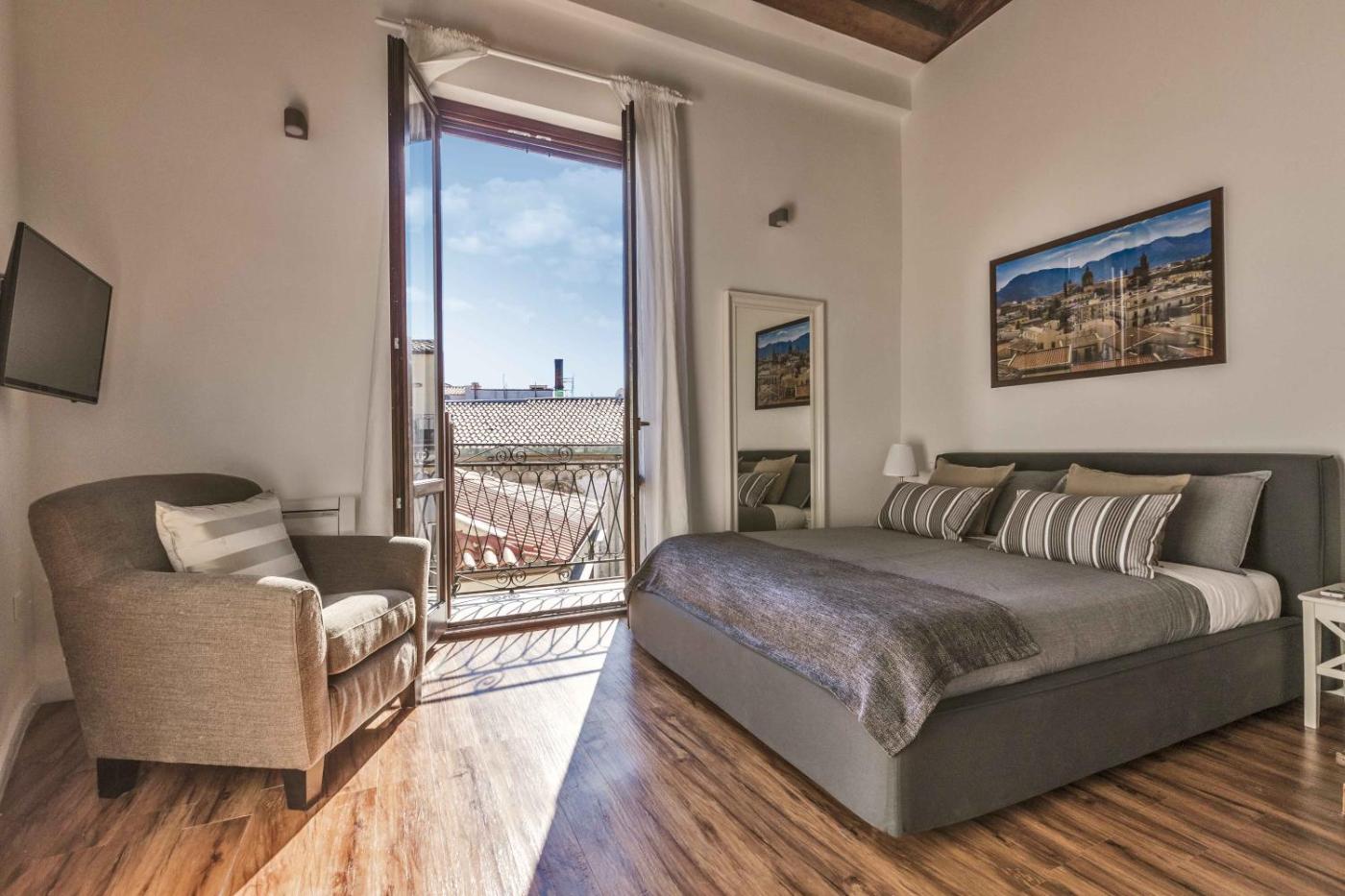 Camera King Superior. The fully equipped kitchenette features a stovetop, a refrigerator, kitchenware and a microwave. This air-conditioned double room includes a flat-screen TV with cable channels, a private bathroom as well as a balcony with city views. The unit offers 1 bed. ;